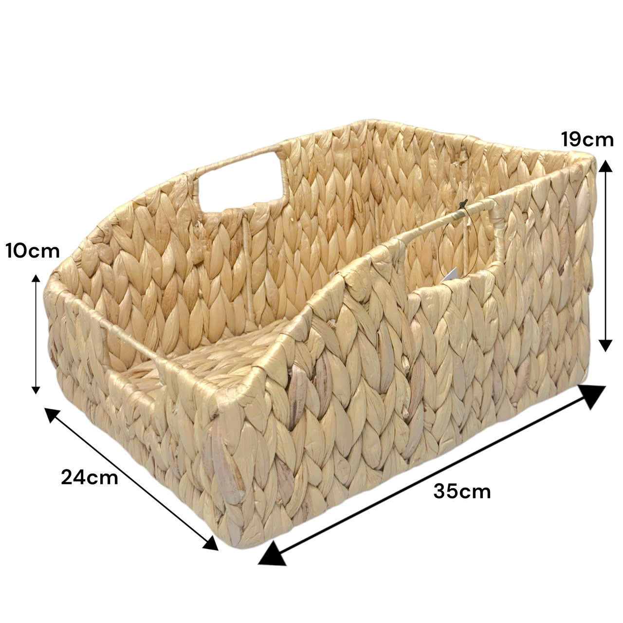 Made from natural water hyacinth, this meticulously hand-woven basket exudes durability and rustic beauty. Designed in a rectangular shape. Sturdy handles on all three sides for easy carrying, available in natural and light brown, perfect for classic, eco-friendly or bohemian interiors. This versatile hand-crafted basket is ideal for storing makeup, stationery, books, magazines, spices or other small household items. Bring a harmonious combination of natural beauty and functionality to your home with this eco-friendly storage box. Whether it is placed on your desk, living room or kitchen, it helps create a more organized and attractive space. Crafted to last, it combines rustic charm with sustainable materials, making it the perfect choice for those pursuing a greener lifestyle.